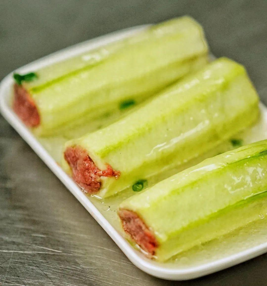 - 将丝瓜洗净后去皮,切成约5厘米高的小段,用勺子将中间挖空备用。