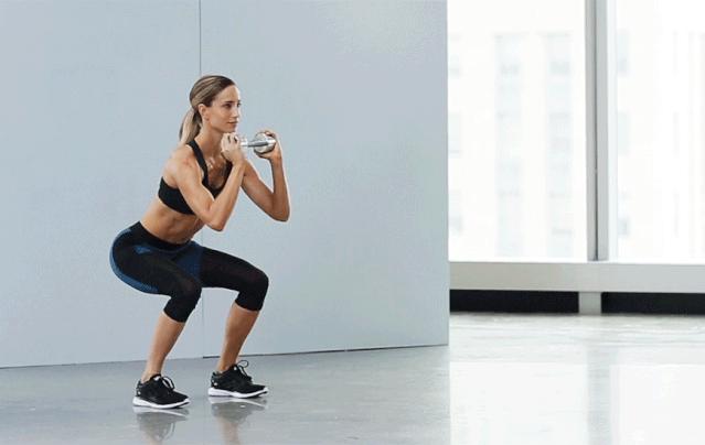 这是一个全身性的燃脂动作,同时能锻炼臀部。进行 15 次,重复 3 组。动作连贯流畅,注意呼吸节奏。